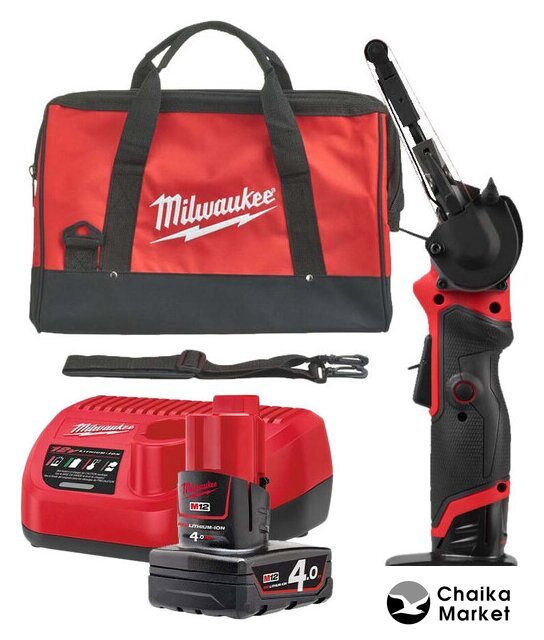 Комплект поставки | - ленточно-шлифовальная машина- з/у MILWAUKEE M12 C12C- 2 аккумулятора MILWAUKEE M12 4,0 Ач M12B4- сумка |