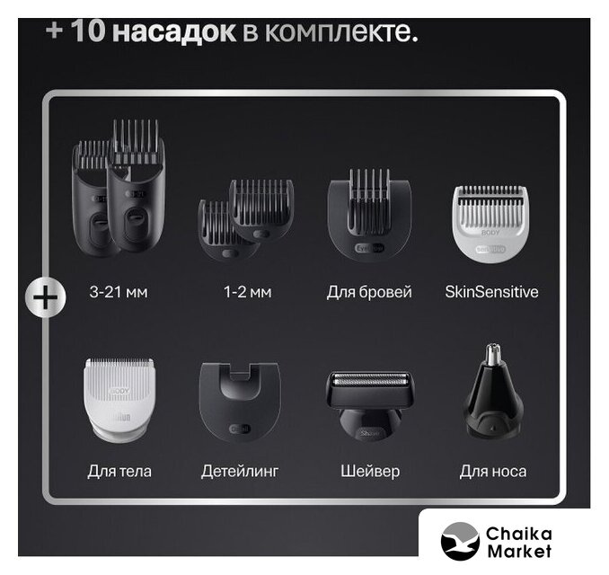 | Насадки | гребни, точный триммер, для носа и ушей, бритва |