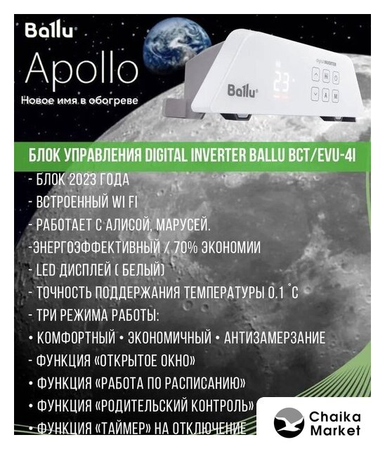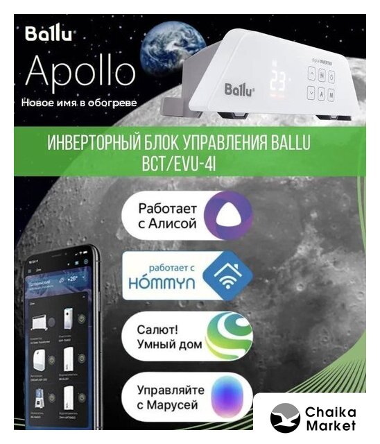 | Комплектация | Отопительный модуль конвектора Ballu BEC/AT-2500; Термостат для климатической техники Ballu Transformer Digital Inverter Wi-Fi BCT/EVU-4I |
