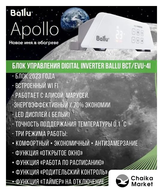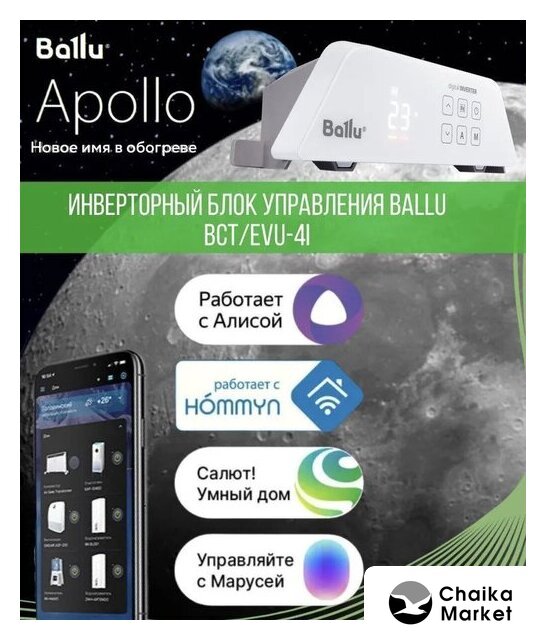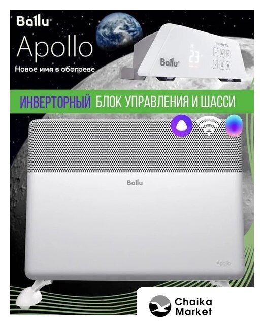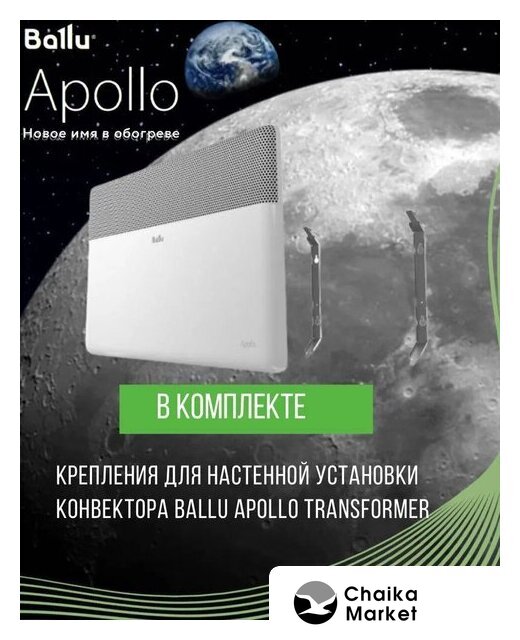 | Комплектация | Отопительный модуль конвектора Ballu BEC/AT-2500; Термостат для климатической техники Ballu Transformer Digital Inverter Wi-Fi BCT/EVU-4I; Ножки для обогревателя Ballu Apollo BFT/AT |