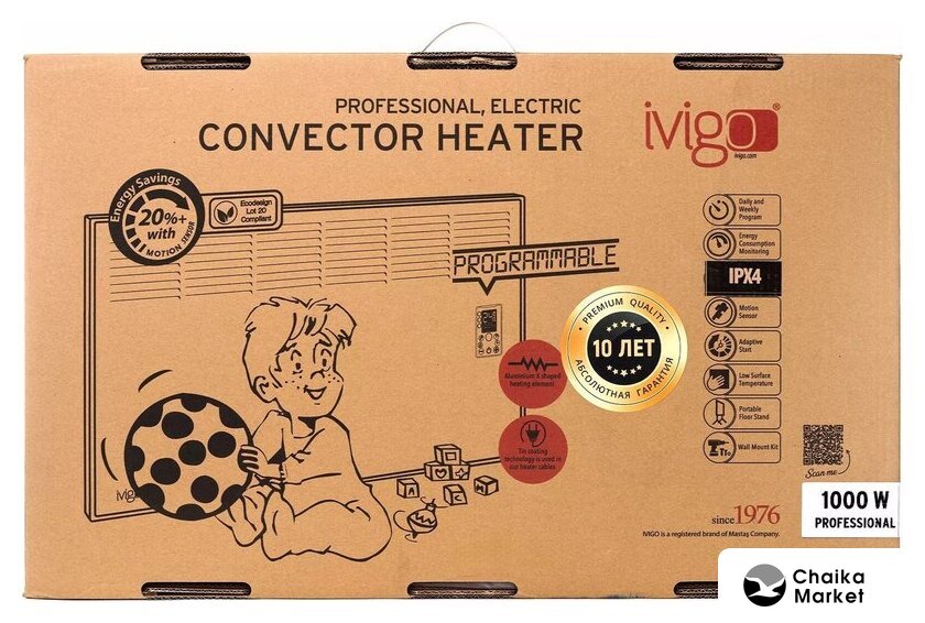 конвектор, монолитный (x-образный), 2000 Вт, термостат, настенный монтаж, управление электронное, площадь обогрева 20 м2