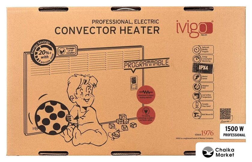 конвектор, монолитный (x-образный), 1500 Вт, термостат, настенный монтаж, управление электронное, площадь обогрева 15 м2
