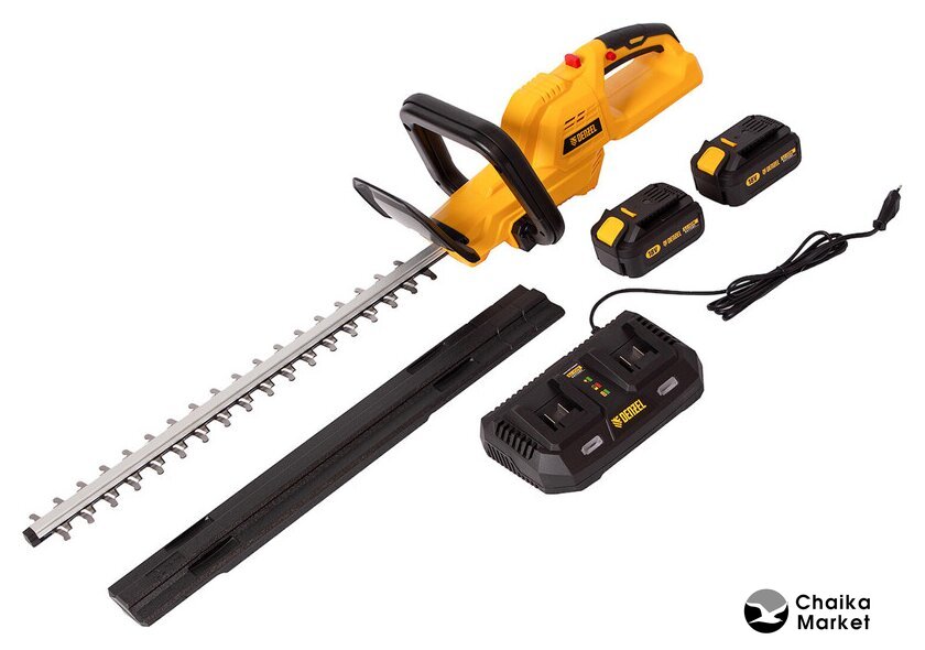 Комплектация | Аккумуляторный кусторез - 1 шт; Аккумулятор Li-ion 18 В, 4 Ач - 2 шт; Зарядное устройство на 2 аккумуляторные батареи - 1 шт; Защитный чехол лезвия - 1 шт; Руководство пользователя - 1 шт |