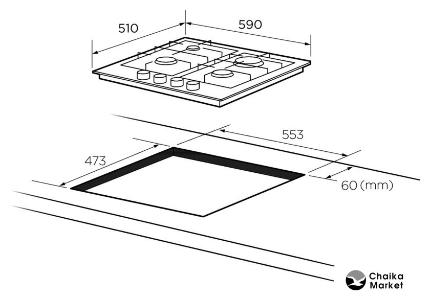 газовая на 4 конфорки, закаленное стекло, мощность: 7700 Вт, автоматический электроподжиг, газ-контроль, решетки: чугун, независимая установка, размеры (ШхГ): 60x52.5 см