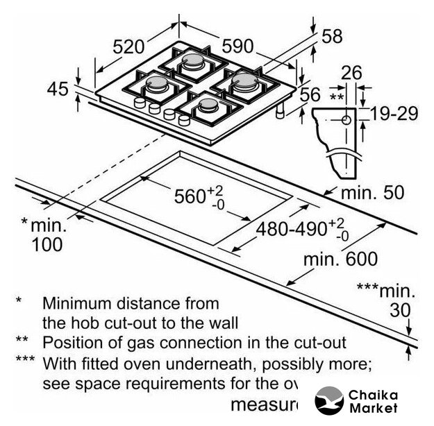газовая на 4 конфорки, закаленное стекло, мощность: 8900 Вт, автоматический электроподжиг, газ-контроль, решетки: чугун, независимая установка, размеры (ШхГ): 59x52 см