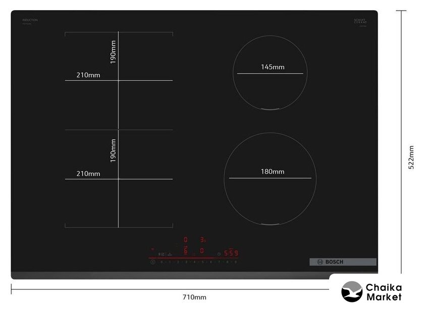 индукционная на 4 конфорки, cтеклокерамика, мощность: 7350 Вт, независимая установка, размеры (ШхГ): 71x52 см