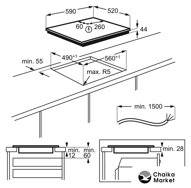 индукционная на 4 конфорки, cтеклокерамика, мощность: 7000 Вт, независимая установка, размеры (ШхГ): 59x52 см