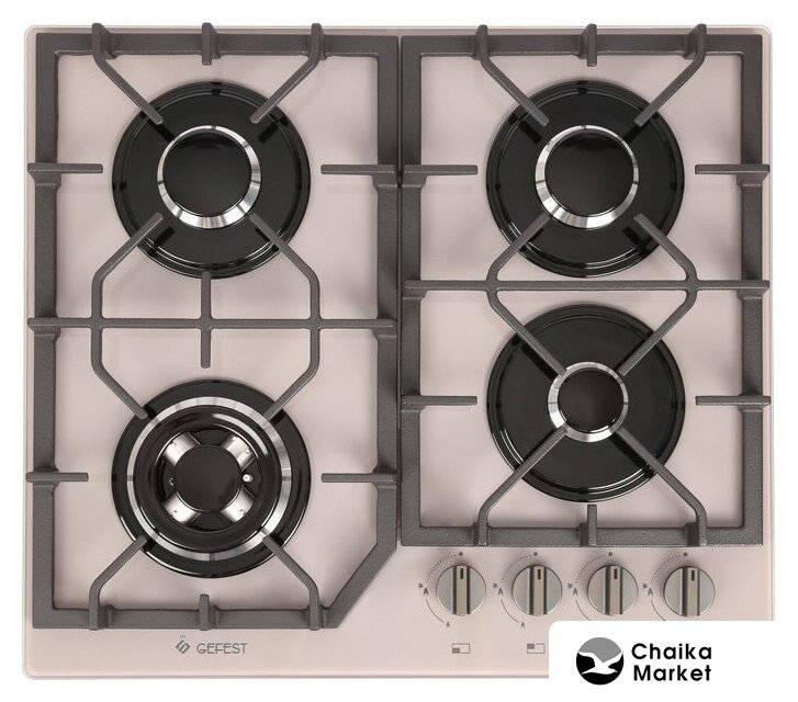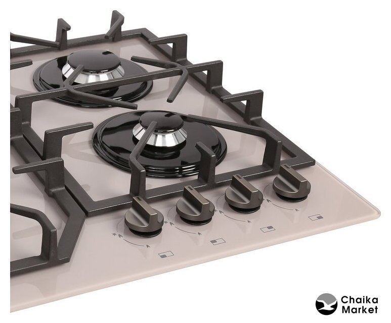 газовая на 4 конфорки, закаленное стекло, мощность: 8000 Вт, автоматический электроподжиг, газ-контроль, решетки: чугун, размеры (ШхГ): 58.4x51 см