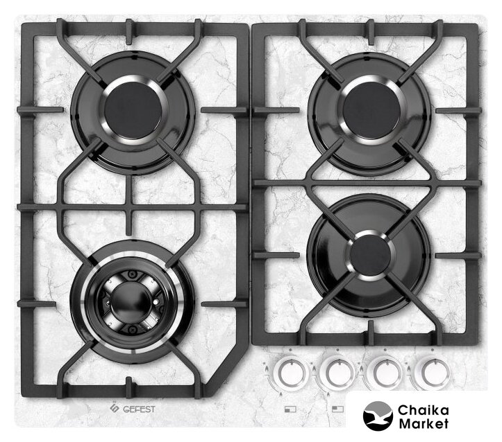 газовая на 4 конфорки, закаленное стекло, мощность: 7060 Вт, газ-контроль, решетки: чугун, независимая установка, размеры (ШхГ): 58.4x51 см