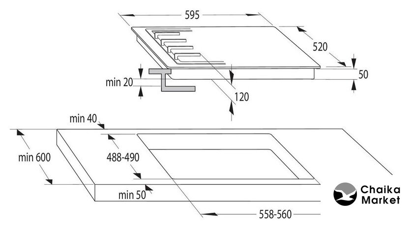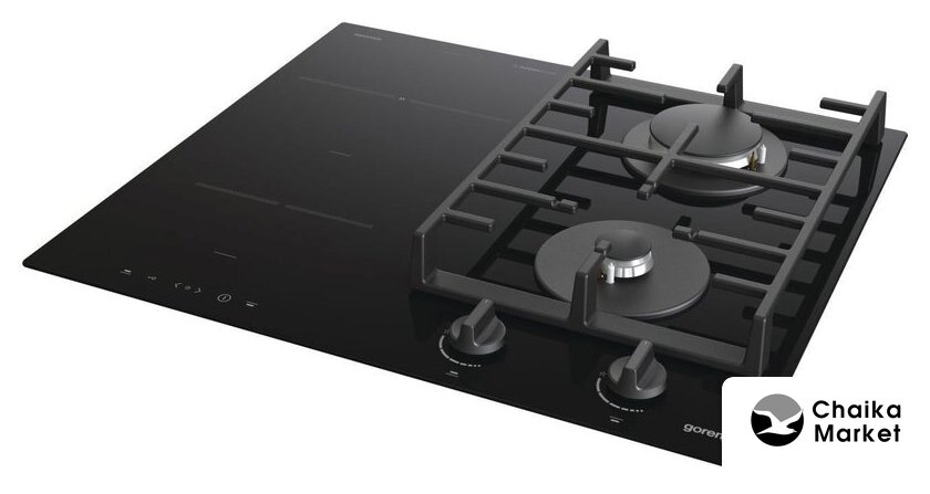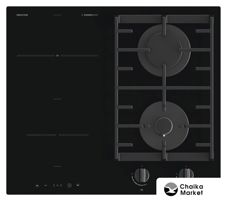 индукционная + газ на 4 конфорки, cтеклокерамика, автоматический электроподжиг, газ-контроль, решетки: чугун, независимая установка, размеры (ШхГ): 59x52 см