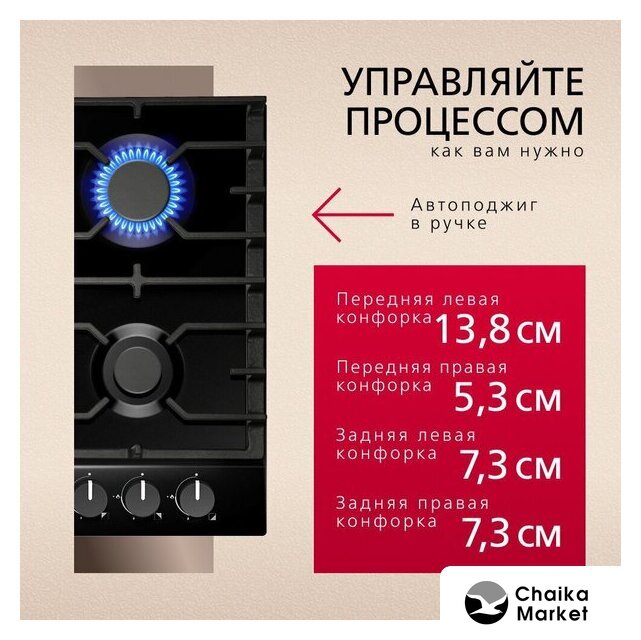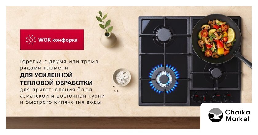 | Подробная информация о конфорках | Передняя левая конфорка - диаметр 13.8 см, мощность 3.5 кВт (WOK); задняя левая конфорка - диаметр 5.3 см, мощность 1.8 кВт; передняя правая конфорка - диаметр 5.3 см, мощность 1 кВт; задняя правая конфорка - диаметр 7.3 см, мощность 1.8 кВт |
