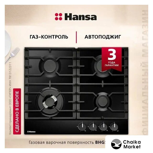 газовая на 3 конфорки, закаленное стекло, мощность: 6400 Вт, автоматический электроподжиг, газ-контроль, решетки: чугун, размеры (ШхГ): 44x51 см