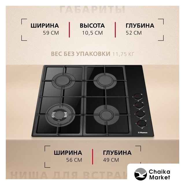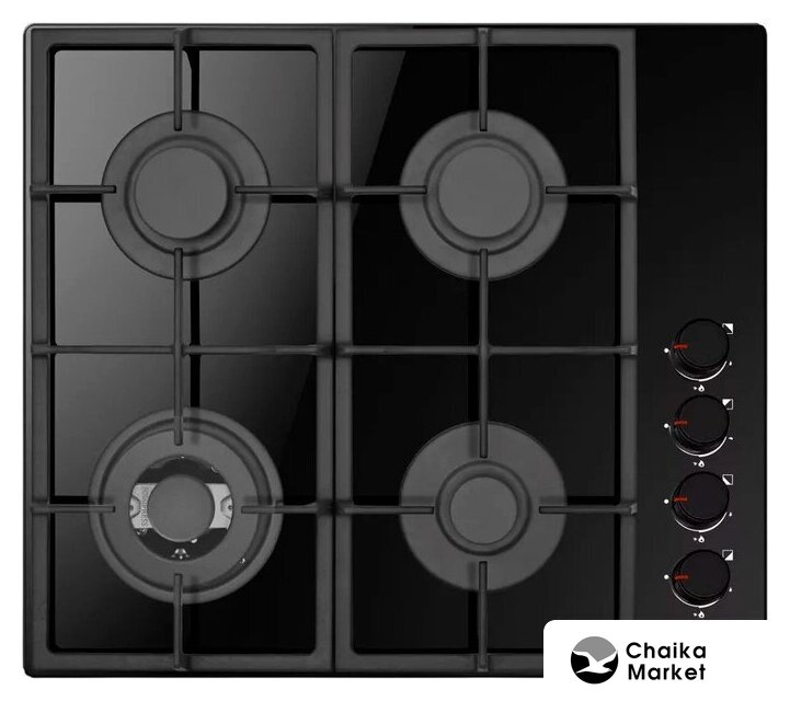 газовая на 4 конфорки, закаленное стекло, мощность: 8100 Вт, автоматический электроподжиг, газ-контроль, решетки: чугун, независимая установка, размеры (ШхГ): 60x52 см