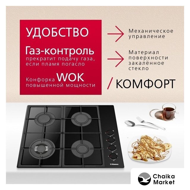 газовая на 4 конфорки, закаленное стекло, мощность: 7000 Вт, автоматический электроподжиг, газ-контроль, решетки: чугун, независимая установка