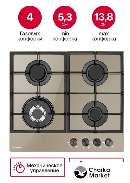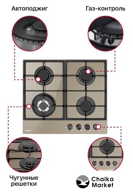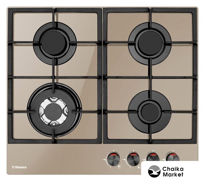 газовая на 4 конфорки, закаленное стекло, мощность: 9100 Вт, автоматический электроподжиг, газ-контроль, решетки: чугун, независимая установка, размеры (ШхГ): 59x51.5 см