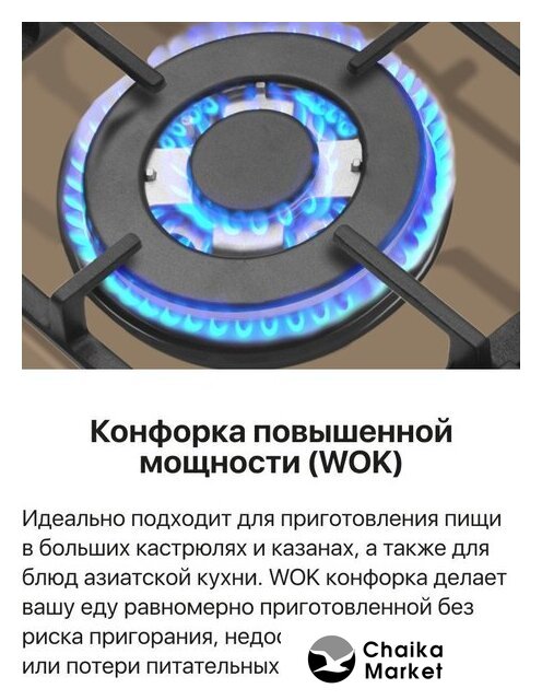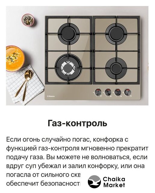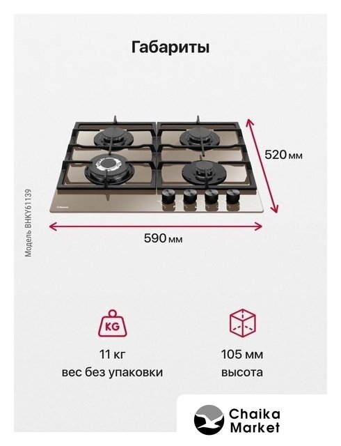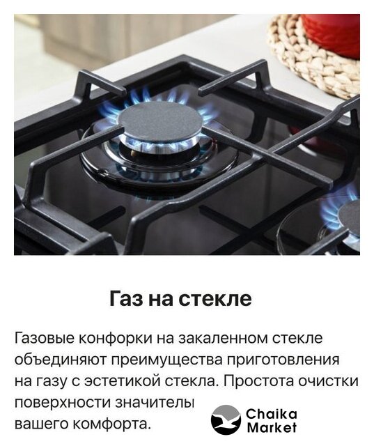 газовая на 4 конфорки, закаленное стекло, мощность: 8060 Вт, автоматический электроподжиг, газ-контроль, решетки: чугун, независимая установка, размеры (ШхГ): 58.4x51 см