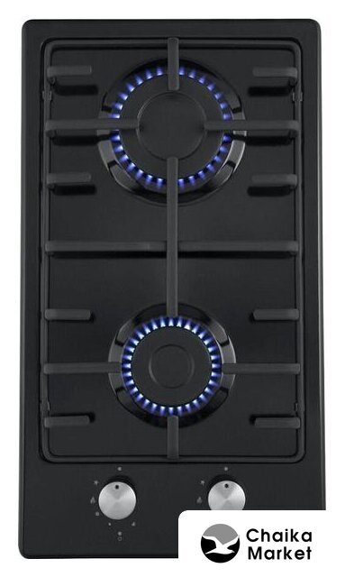 газовая на 2 конфорки, закаленное стекло, мощность: 3500 Вт, автоматический электроподжиг, газ-контроль, решетки: чугун, независимая установка, размеры (ШхГ): 30x53 см