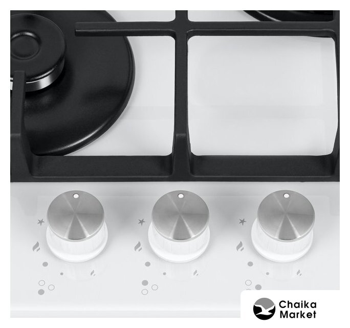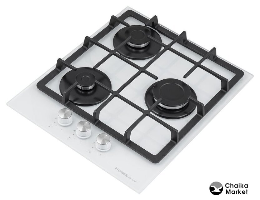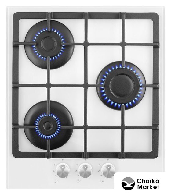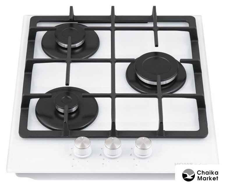 газовая на 3 конфорки, закаленное стекло, мощность: 6500 Вт, автоматический электроподжиг, газ-контроль, решетки: чугун, независимая установка, размеры (ШхГ): 44x51 см