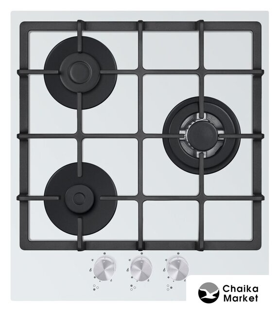 газовая на 3 конфорки, закаленное стекло, мощность: 6250 Вт, автоматический электроподжиг, газ-контроль, решетки: чугун, размеры (ШхГ): 45x51 см