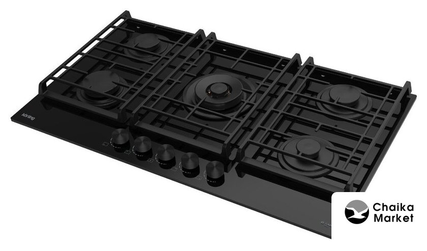 газовая на 5 конфорок, закаленное стекло, мощность: 10250 Вт, автоматический электроподжиг, газ-контроль, решетки: чугун, независимая установка, размеры (ШхГ): 86x52 см