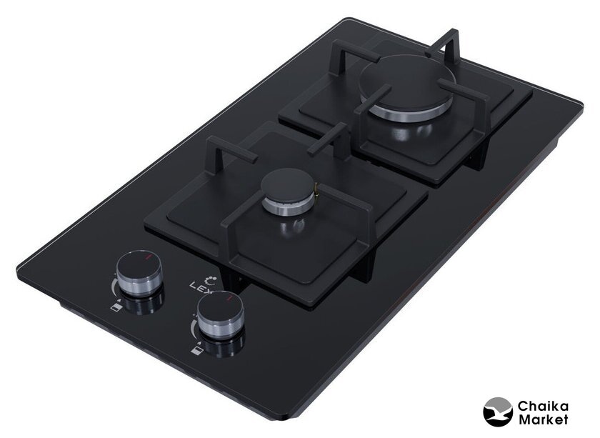 газовая на 2 конфорки, закаленное стекло, мощность: 5550 Вт, автоматический электроподжиг, газ-контроль, решетки: чугун, независимая установка, размеры (ШхГ): 30.3x52 см