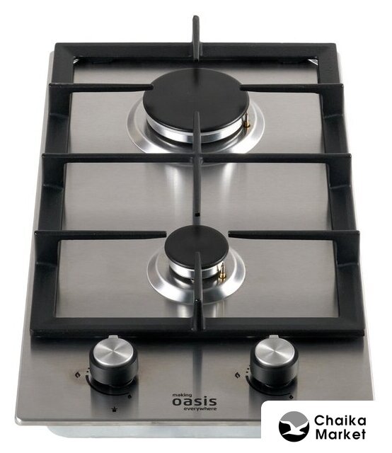 газовая на 2 конфорки, нержавеющая сталь, мощность: 4000 Вт, автоматический электроподжиг, решетки: эмалированная сталь, размеры (ШхГ): 30x51 см