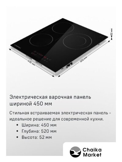 HiLight на 3 конфорки, cтеклокерамика, мощность: 4800 Вт, независимая установка, размеры (ШхГ): 45x52 см