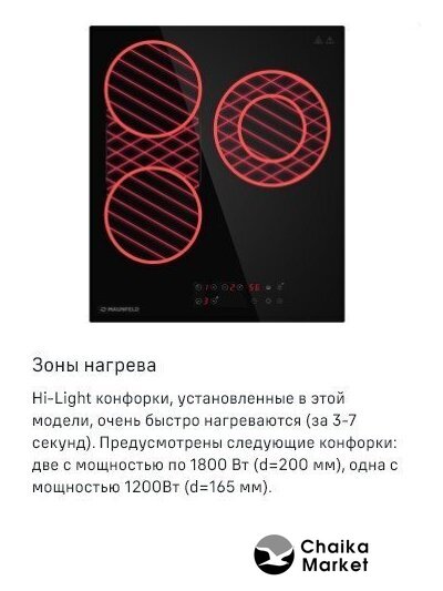 | Подробная информация о конфорках | 2х1200Вт1х900/1800 Вт |