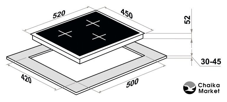 HiLight на 3 конфорки, cтеклокерамика, мощность: 4200 Вт, независимая установка, размеры (ШхГ): 45x52 см
