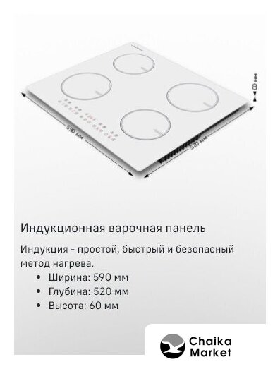 индукционная на 4 конфорки, cтеклокерамика, мощность: 7000 Вт, независимая установка, размеры (ШхГ): 58x51 см