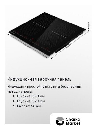 индукционная на 4 конфорки, cтеклокерамика, мощность: 7400 Вт, независимая установка, размеры (ШхГ): 59x52 см