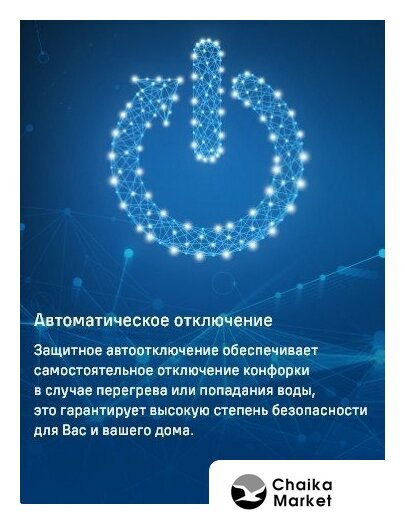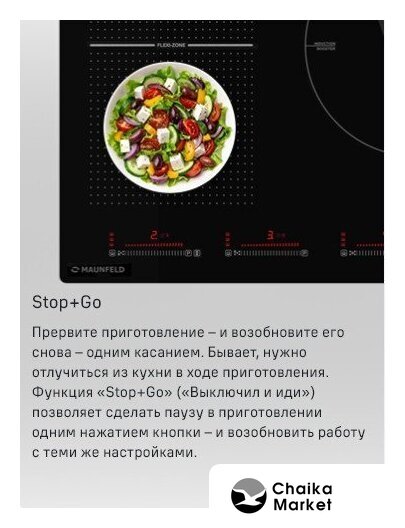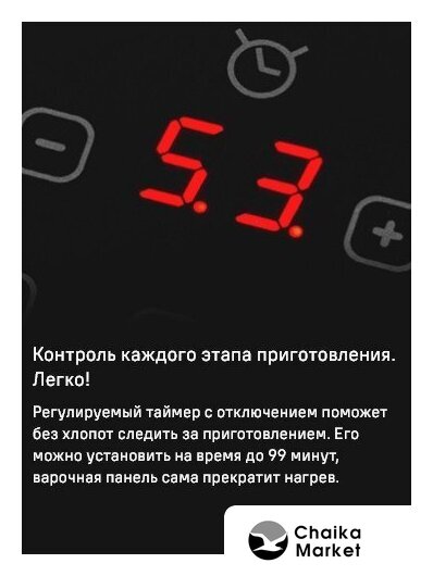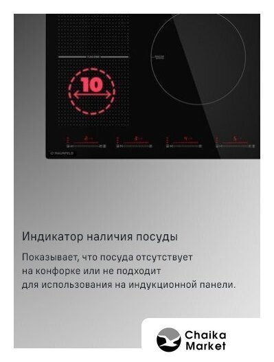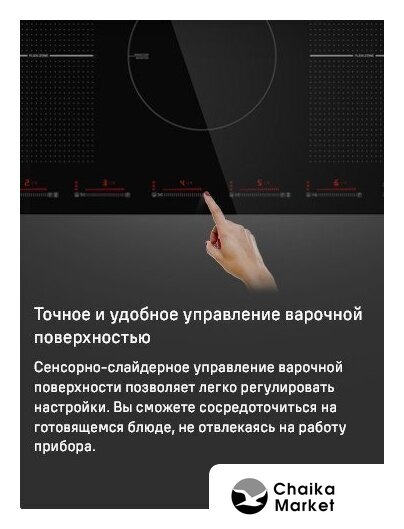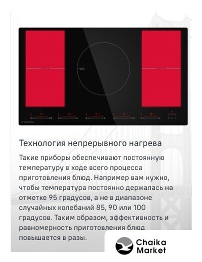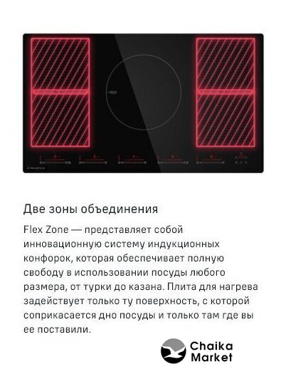 Подробная информация о конфорках | 2х1500Вт (бустер 2000Вт)2х2000Вт (бустер 2800Вт)1x2300Вт (бустер 3000Вт) |