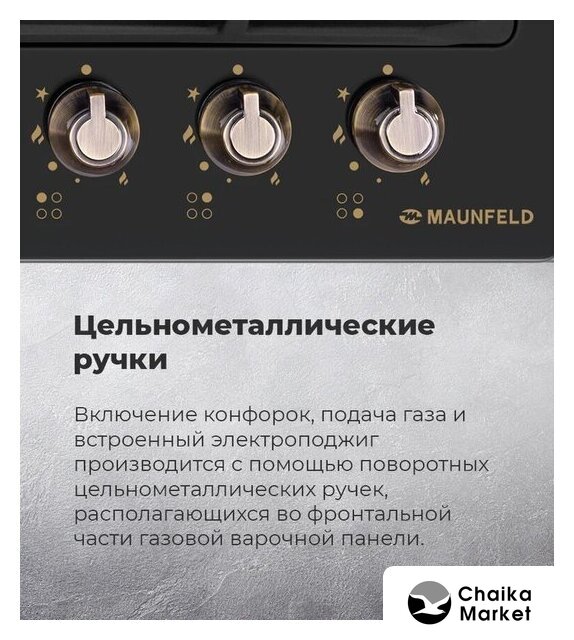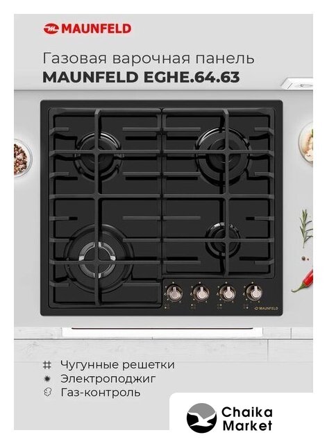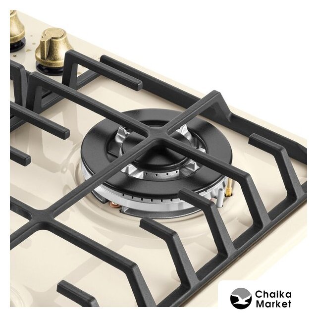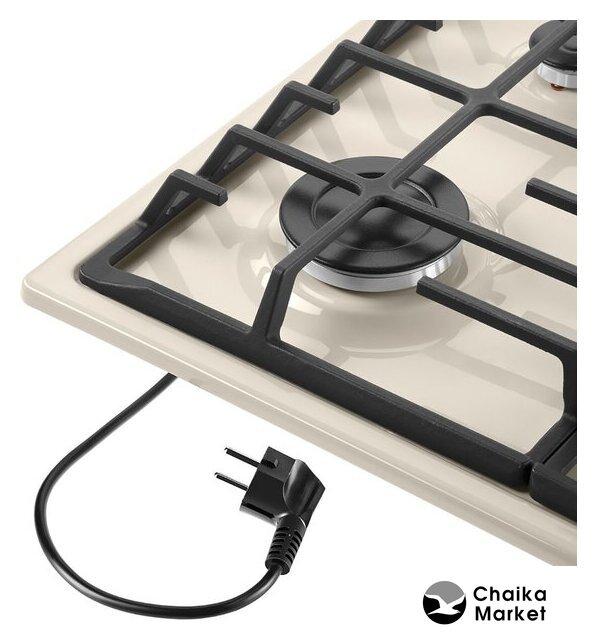 газовая на 4 конфорки, закаленное стекло, мощность: 7400 Вт, автоматический электроподжиг, газ-контроль, решетки: чугун