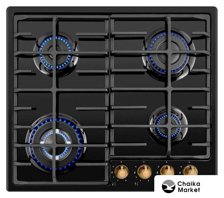 газовая на 4 конфорки, закаленное стекло, мощность: 9100 Вт, автоматический электроподжиг, газ-контроль, решетки: чугун, независимая установка, размеры (ШхГ): 59x51.5 см
