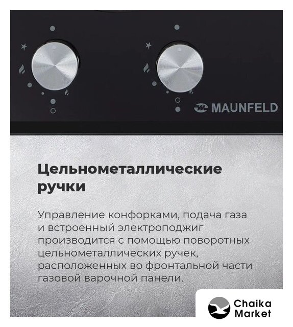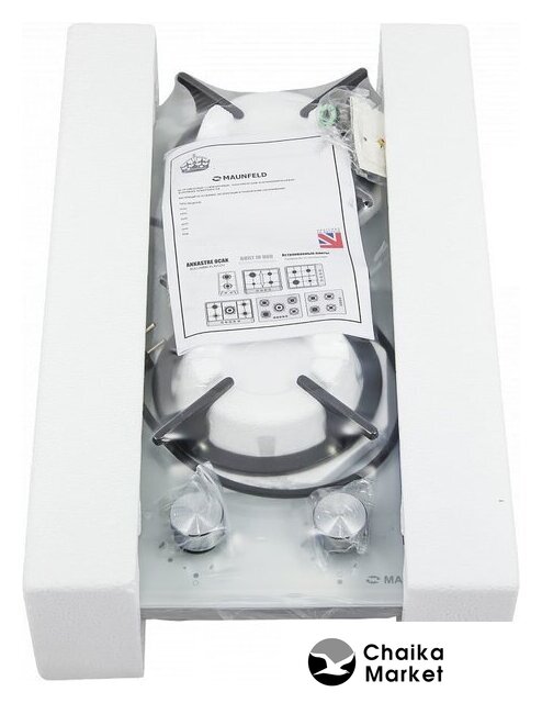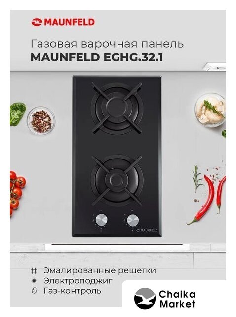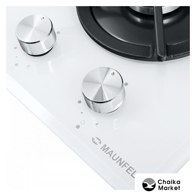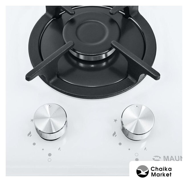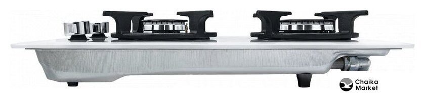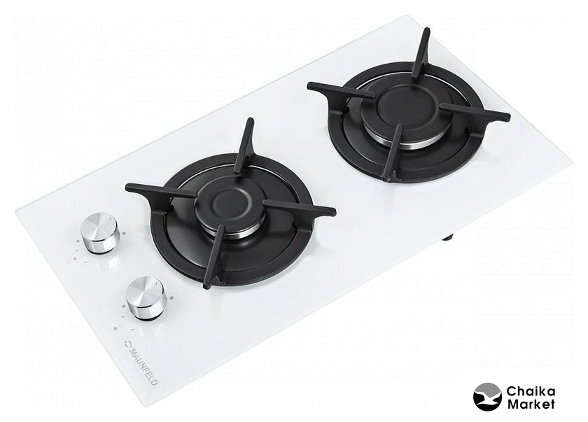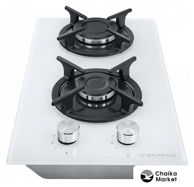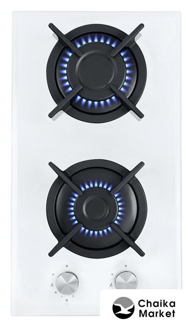 газовая на 2 конфорки, закаленное стекло, мощность: 4300 Вт, автоматический электроподжиг, газ-контроль, решетки: чугун, независимая установка