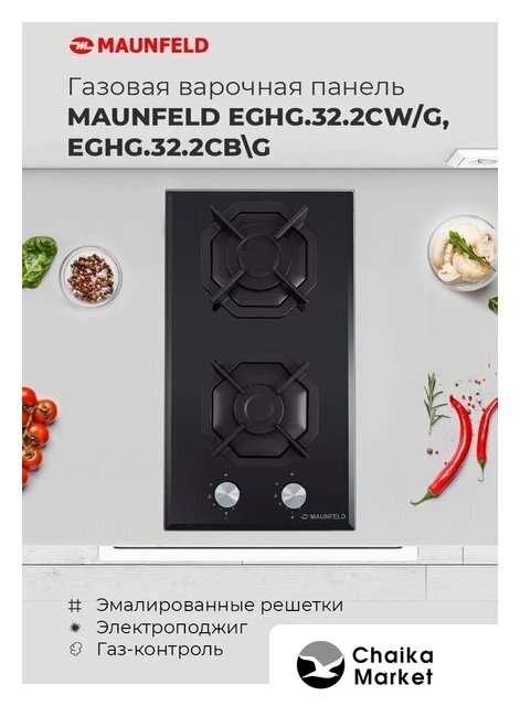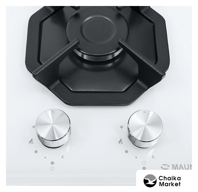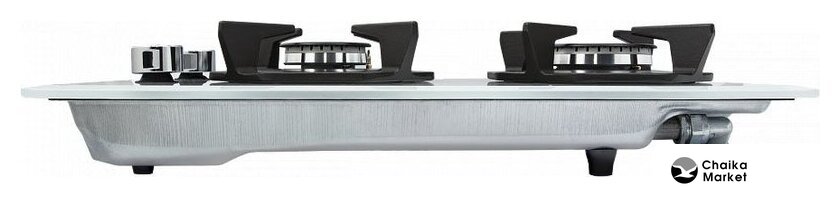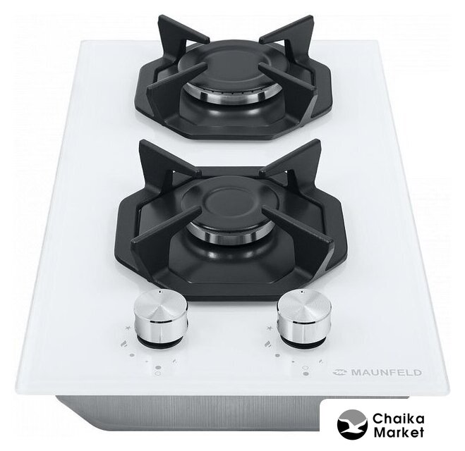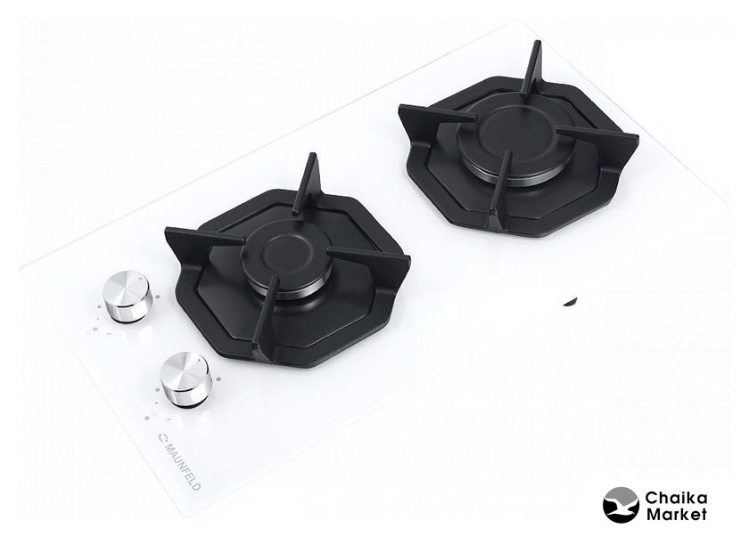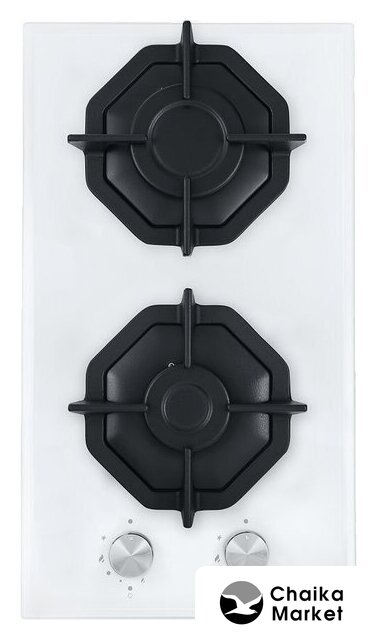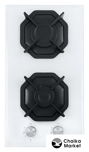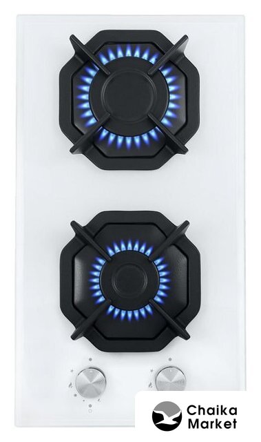 газовая на 2 конфорки, закаленное стекло, мощность: 3800 Вт, автоматический электроподжиг, газ-контроль, решетки: чугун, независимая установка, размеры (ШхГ): 32x52 см