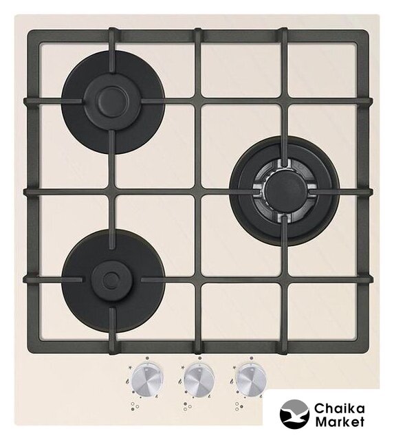 газовая на 3 конфорки, закаленное стекло, мощность: 5700 Вт, автоматический электроподжиг, газ-контроль, решетки: чугун, независимая установка, размеры (ШхГ): 52x52 см