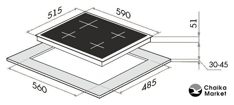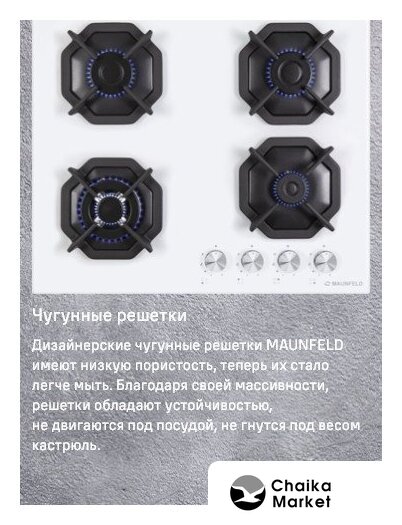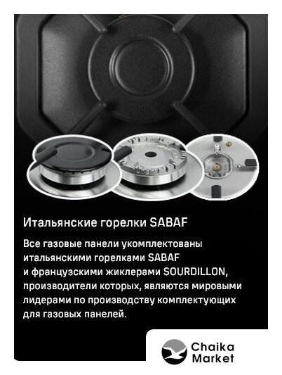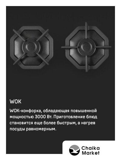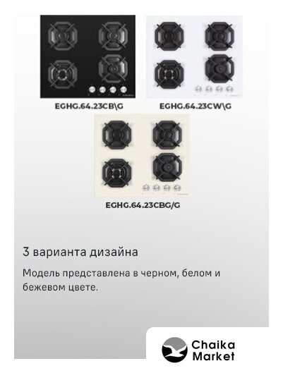 | Подробная информация о конфорках | 4 конфорки мощностью: 3000, 1700, 1700, 1000 Вт |