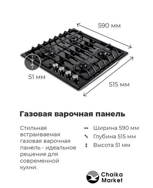 газовая на 4 конфорки, закаленное стекло, мощность: 8200 Вт, автоматический электроподжиг, газ-контроль, решетки: чугун, независимая установка, размеры (ШхГ): 59x51.5 см