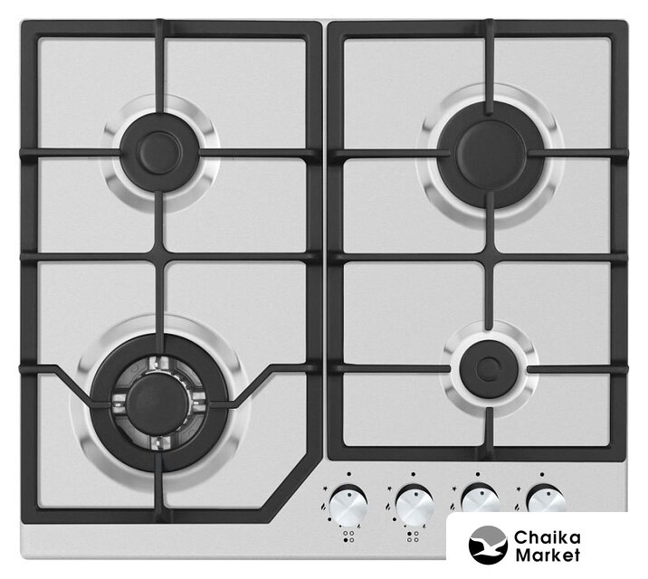 газовая на 4 конфорки, нержавеющая сталь, мощность: 10100 Вт, автоматический электроподжиг, газ-контроль, решетки: чугун, размеры (ШхГ): 60x51 см