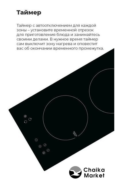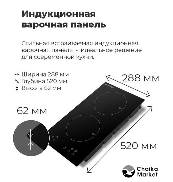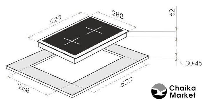индукционная на 2 конфорки, cтеклокерамика, независимая установка, размеры (ШхГ): 30x52 см