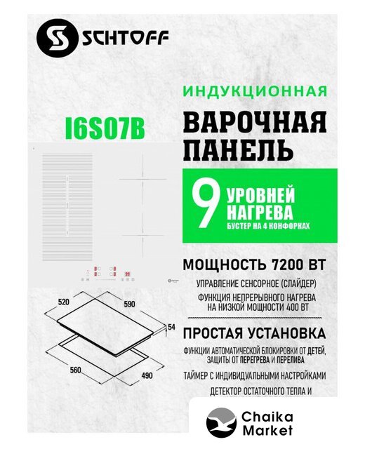 индукционная на 4 конфорки, cтеклокерамика, мощность: 7200 Вт, независимая установка, размеры (ШхГ): 59x52 см