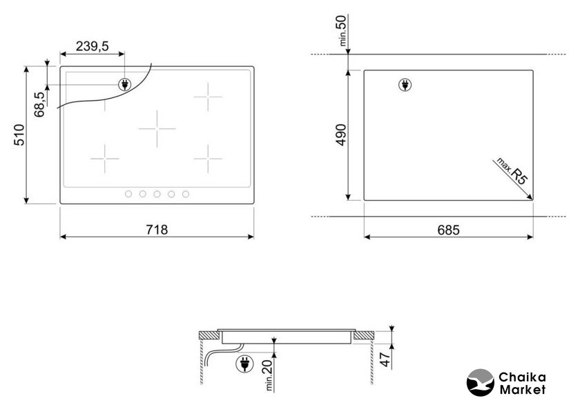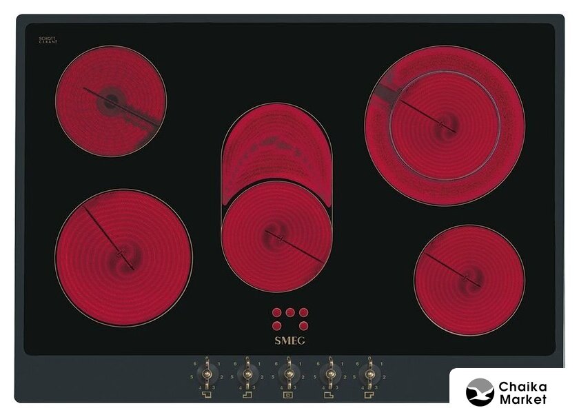 Подробная информация о конфорках | Задняя левая: 1,2 кВт, ø 140 ммПередняя левая: 2,0 кВт, ø120- 180 ммЦентральная: 2,0 кВт, ø148х253 мм Задняя правая: 2,4 кВт, ø 144-214 ммПередняя правая: 1,2 кВт, ø 148 мм |