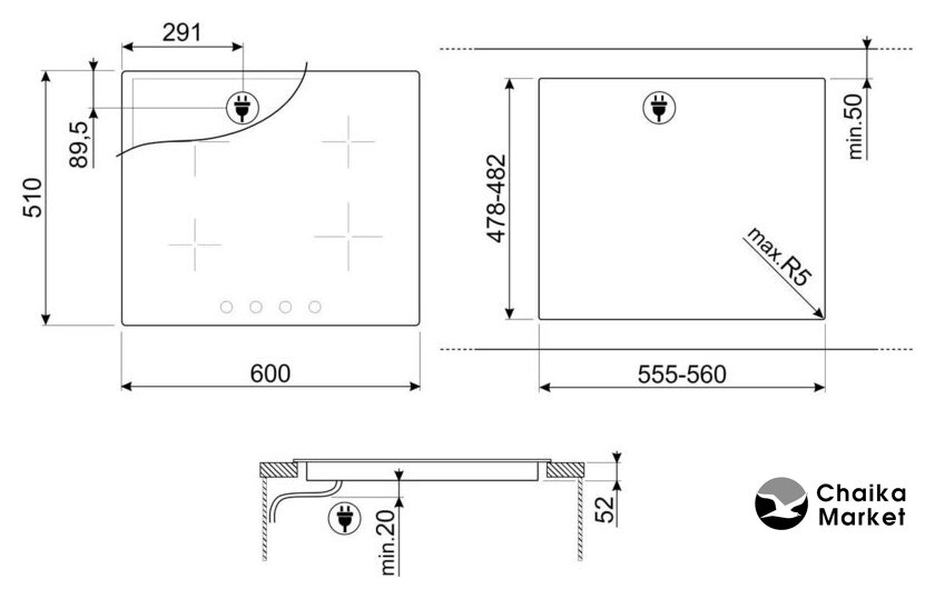 индукционная на 4 конфорки, cтеклокерамика, мощность: 7400 Вт, независимая установка, размеры (ШхГ): 60x51 см