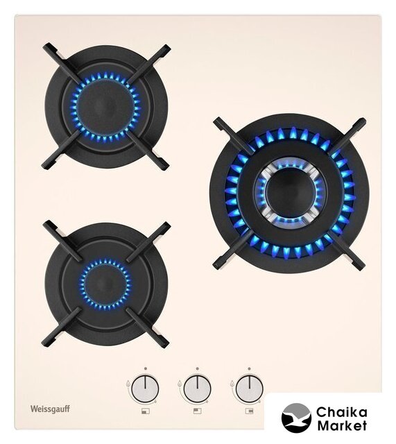 газовая на 3 конфорки, закаленное стекло, мощность: 6200 Вт, автоматический электроподжиг, газ-контроль, решетки: чугун, независимая установка, размеры (ШхГ): 45x51 см