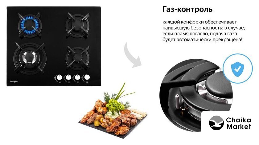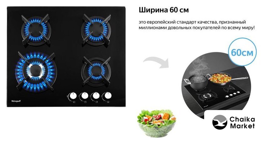 газовая на 4 конфорки, нержавеющая сталь, мощность: 7300 Вт, автоматический электроподжиг, газ-контроль, решетки: чугун, независимая установка, размеры (ШхГ): 60x52 см