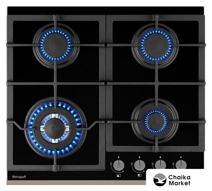 газовая на 4 конфорки, закаленное стекло, мощность: 7000 Вт, автоматический электроподжиг, газ-контроль, решетки: чугун, независимая установка