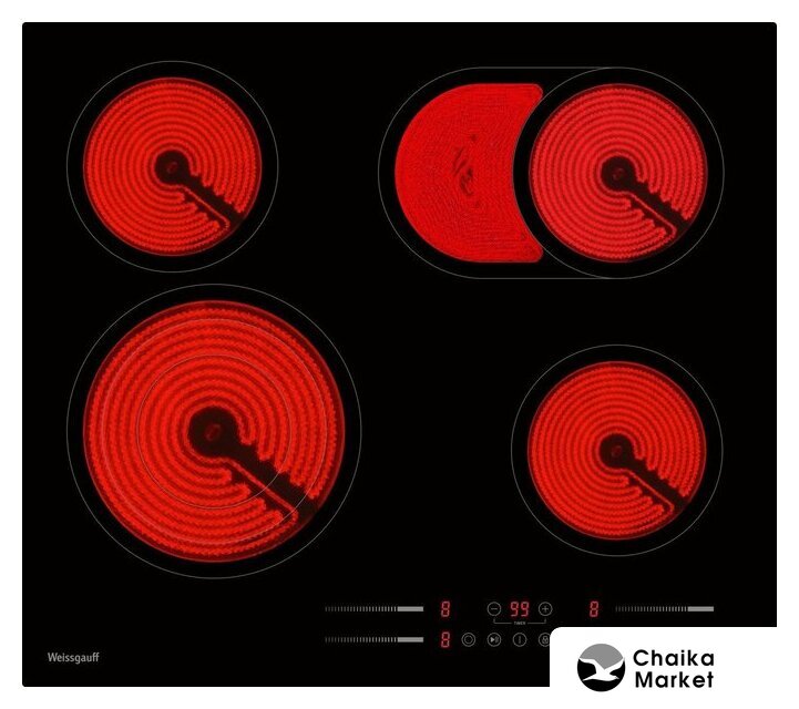 Подробная информация о конфорках | Тройная зона: ⌀230/175/138мм, 2300/1500/700Вт , 2- ⌀165 мм, 1200 Вт, Овальная зона: 270*165 мм, 2000/1100 Вт |
