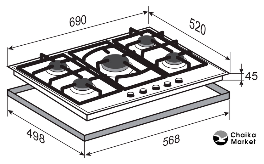 газовая на 4 конфорки, закаленное стекло, мощность: 8000 Вт, автоматический электроподжиг, газ-контроль, решетки: чугун, независимая установка, размеры (ШхГ): 58x51 см