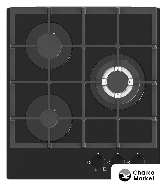 газовая на 3 конфорки, закаленное стекло, мощность: 6250 Вт, автоматический электроподжиг, газ-контроль, решетки: чугун, независимая установка, размеры (ШхГ): 45x51 см